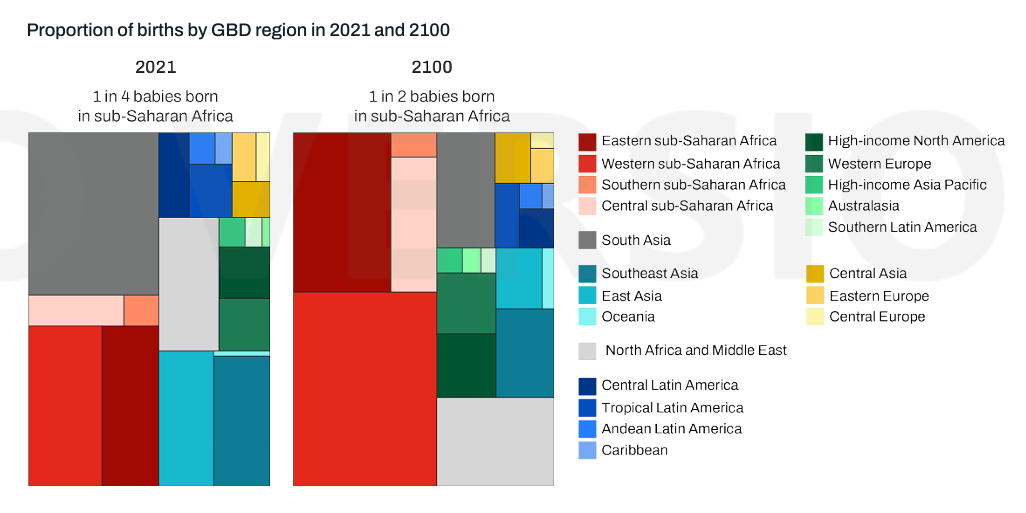 Over tre fjerdedele af alle fødsler vil finde sted i lavere middel og lavindkomstlande ved århundredets slutning, og over halvdelen vil finde sted syd for Sahara. Den globale fødselsrate vil være faldet fra 5 børn i 1950 til 2.2 i 2100. 110 lande vil (54%) vil ikke have fødsler nok til at opretholde befolkningen.