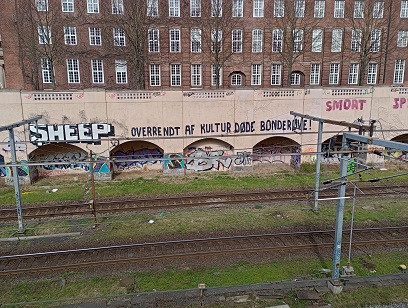 Sidste gang, jeg var i København opdagede jeg at nedenstående var skrevet på muren ved det firetog, jeg var kommet ind i staden med. Den var svær at stå for.