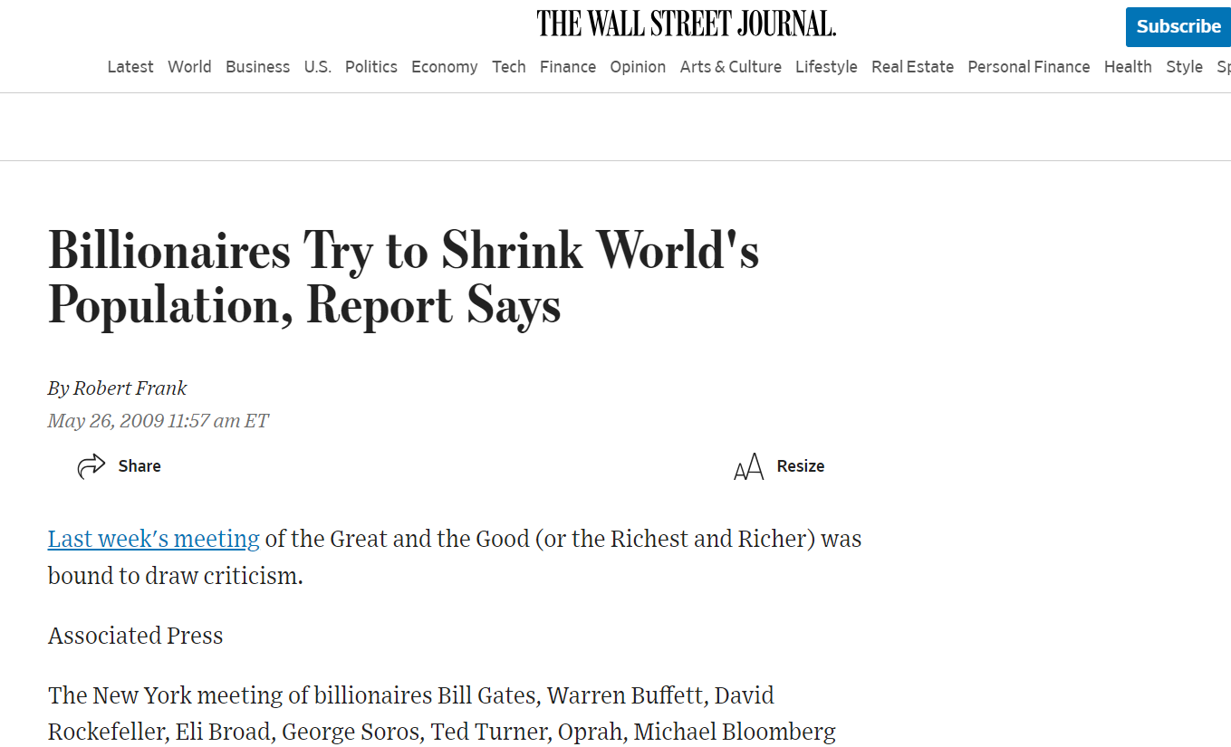 Wall Street Journal 26.5 2009: Billionaires Try to Shrink World’s Population, Report Says