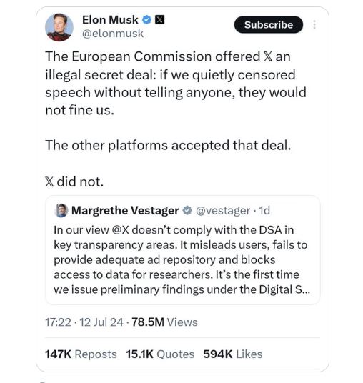 Når verden rykker, så rykker den, skal jeg love for. Elon Musk fik lige udstillet censurheksen Margrethe Vestager. Læg mærke til mere end 78 mio. visninger. Og så er Trump lige blevet sikret valgsejren med mordforsøget mod ham. Af danske medier, som TV2NordKorea, beskrevet som “skudepisode ved Trumps vælgermøde”