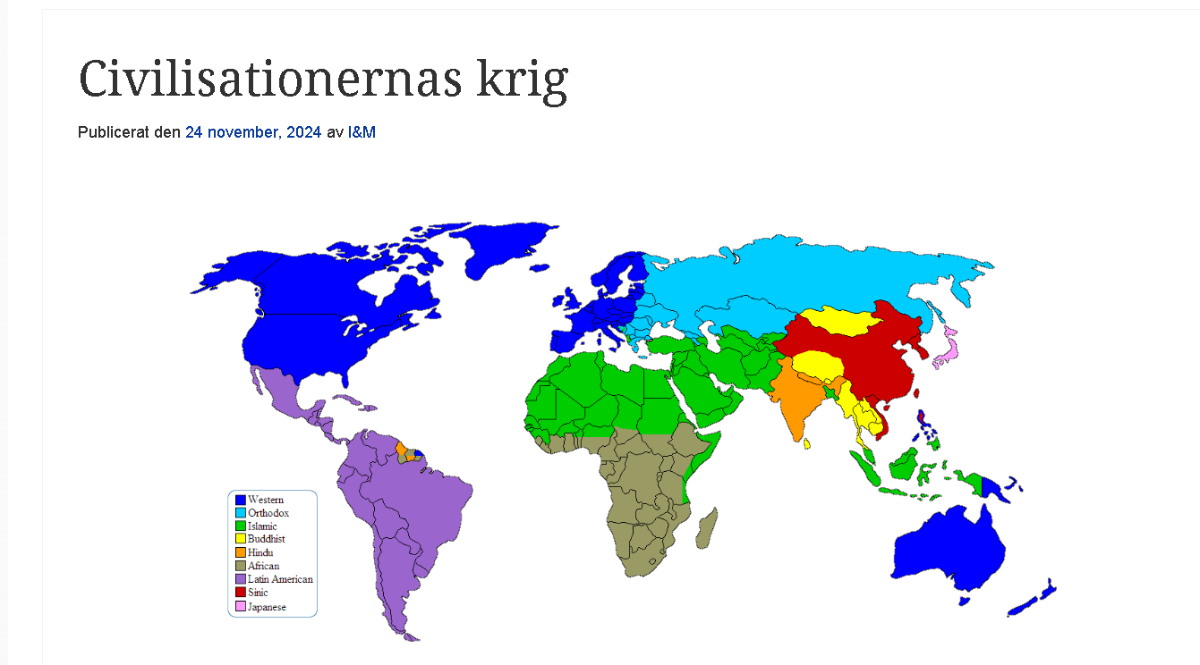 1996 publicerade den amerikanske statsvetaren Samuel P. Huntington sitt magnum opus, ”The Clash of civilizations and the remaking of world order”. Den tes han driver är att det finns nio civilisationer i världen och att dessa värderingsmässigt bekämpar varandra. Det är alltså inte ekonomier som konkurrerar, vilket är grundtanken i marxismens materialism, inte heller är det ideologier eller nationalstater utan det är det mest omfattande, civilisationer i form av kulturer, religioner och levnadssätt sammantaget. De civilisationer Huntington urskiljer är: