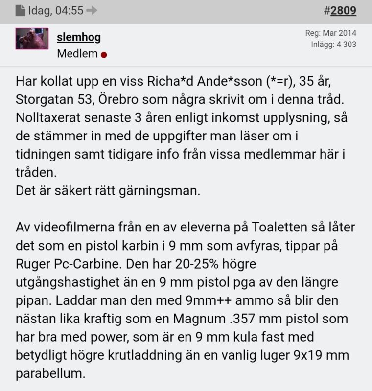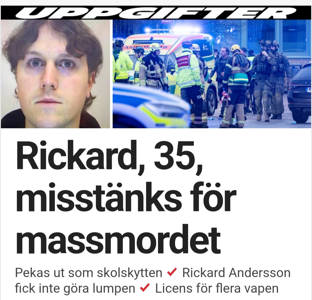 Gerningsmanden er med 99% sikkerhed en lokal, svensk, arbejdsløs særling, Rickard Andersson, en “enstöring”, som han kaldes. Angrebet på Komvux, som er en skole for voksne, er et angreb på enten skolen eller indvandrere, for 90 % af dem der går der, er indvandrere. Nogle af hans poster kunne pege imod en hævn for mordet på Salwan Momika. “Ingen ideologiske motiver, ” skriver Aftonbladet. Det bliver foreløbig magtens fortælling til det første chock har lagt sig. Det vil vare til efter begravelserne, før det bliver udnyttet politisk.
