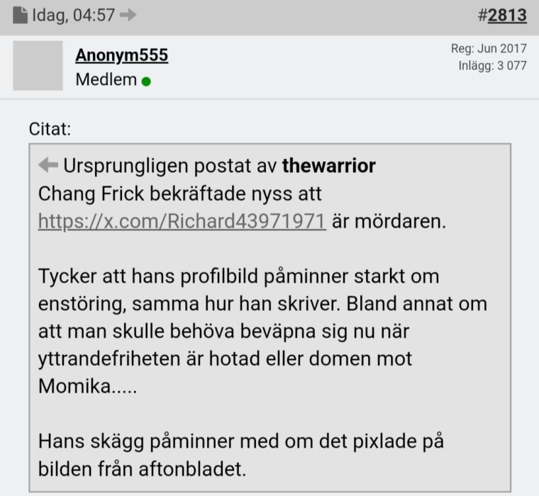Hører man de videoklip, som findes, er det da også kun gebrokkent svensk, man hører. Går man hans Twitter-X igennem, forekommer motivet tænkeligt. Posterne er udelukket rettet mod indvandringen. Vil I helt ned i detaljerne, er det hos folkedetektiverne på Flashback som sædvanligt. Der finder man også identiteten.