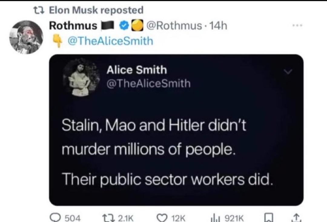 Jeg kunne formode at baggrunden for at hævde, som Elon Musk gør er et modsvar til marxisternes argument, at det er arbejderklassen, der via deres arbejde skaber samfundets værdier. Offentligt ansatte lever således selv på at udnytte arbejderklassens arbejdsindsats. Og sandt er det at de, der planlagde og udførte Holocaust, Gulag og den kinesiske Kulturrevolution mv. var i statens sold – altså offentlig ansatte. Fra Adolf Eichmann over Vasily Blokhin til Xie Fuzhi var offentligt ansatte i det statsapparat, der stod for mordene. Eichmann var den offentligt embedsmand der koordinerede transporterne og effektiviserede massemordene, Vasily Blokhin myrdede personligt 7000 polakker… Read more »