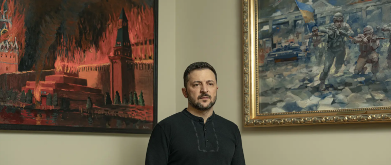 “Each one’s about victory,” siger den patologiske løgner Zelensky i et nyt interview i Time. om sine yndlingsmalerier. Til venstre Kreml der brænder, til højre ukrainske soldateri kamp. Zelensky hader russere af et sandt hjerte, og vi financierer det med snart trecifrede milliardbeløb.