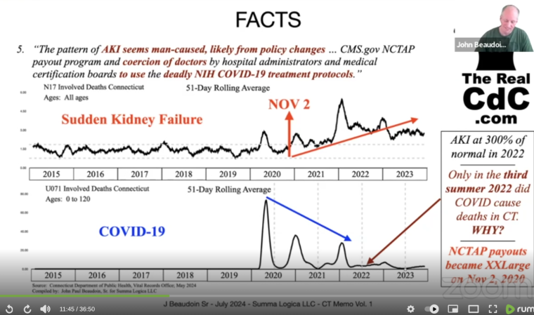 155.000 ekstra dødsfald af nyresvigt fra 2020-2023. John Beaudoin jr. er forfatter til bogen The Real CDC: Covid Facts for Regular People. og har i flere år forsøgt at råbe myndighederne op. Han har endda personligt afleveret skrivelser, så de ikke kunne benægte modtagelsen. Men han bliver tiet ihjel. Ingen adresserer den stigning i dødsfald, der har været i tre store østlige stater i USA. Det er det samme i Danmark og i alle vaccinerede lande. Hvorfor lader de tusinder dø i tavshed?