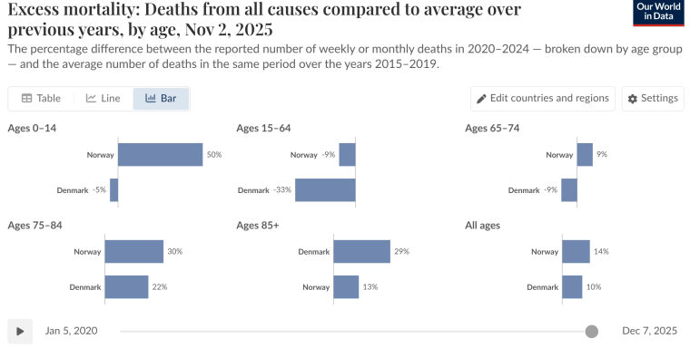 Excess mortality: Deaths from all causes compared to average over previous years, by age. (Denmark/Norway)