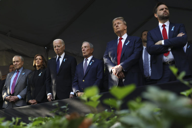 From left, Sen. Chuck Schumer, R-NY, Democratic presidential nominee Vice President Kamala Harris, President Joe Biden, Michael Bloomberg, Republican presidential nominee former President Donald Trump and Republican vice presidential nominee Sen. JD Vance, R-Ohio, attend the 9/11 Memorial ceremony on the 23rd anniversary of the Sept. 11, 2001 terror attacks, Wednesday, Sept. 11, 2024, in New York. (AP Photo/Yuki Iwamura)